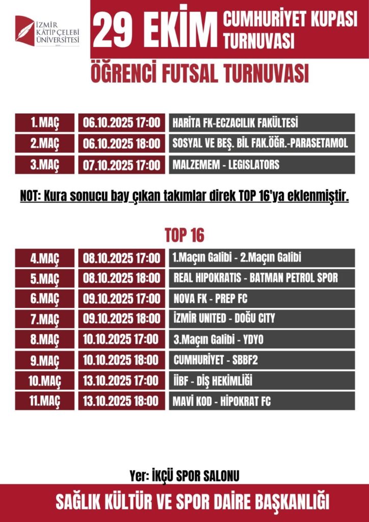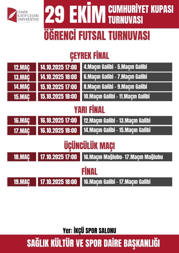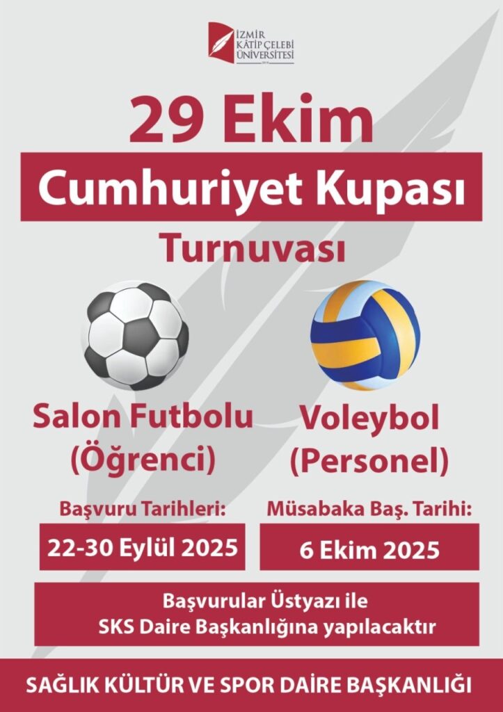 İzmir Kâtip Çelebi Üniversitesi (İKÇÜ) Sağlık Kültür ve Spor Daire Başkanlığı tarafından organize edilen 29 Ekim Cumhuriyet Kupası Turnuvası 6 Ekim’de başlıyor.