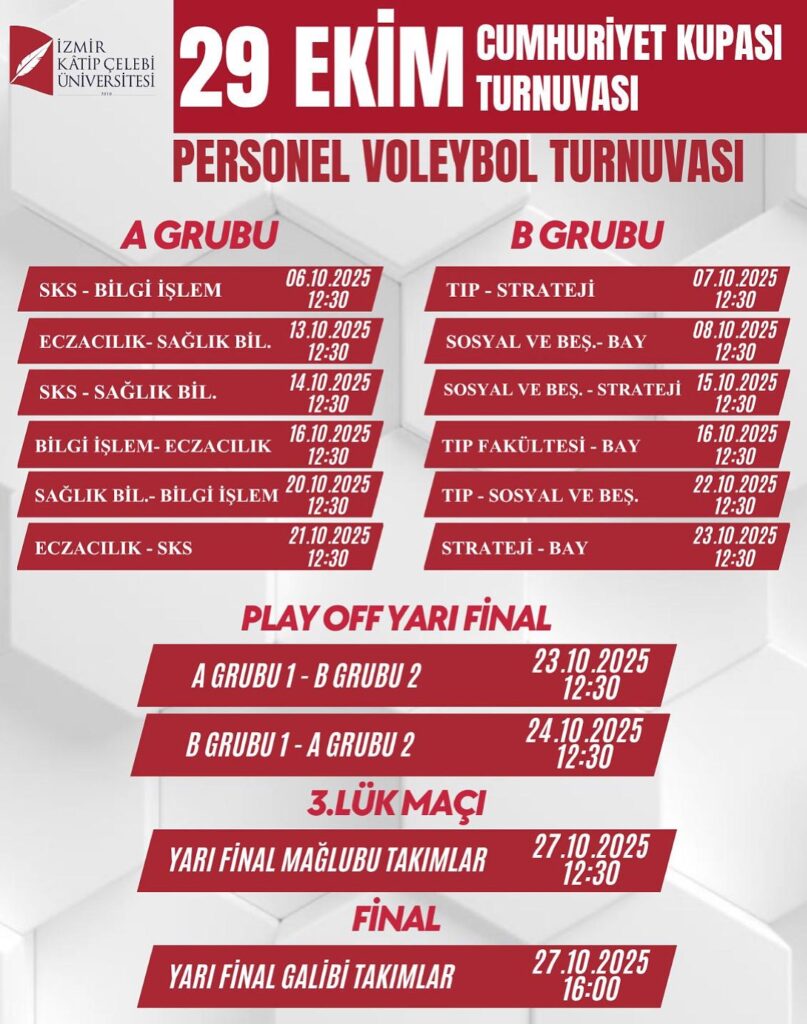 Cumhuriyet’in kuruluşunun 102. Yılı anısına düzenlenen turnuvada, İKÇÜ akademik ve idari personelleri ile öğrencileri tarafından oluşturulan takımlar Voleybol ve Salon Futbolu (Futsal) branşlarında mücadele edecek.