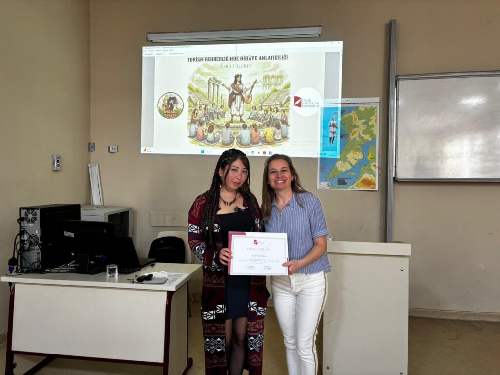 Söyleşinin devamında, turist rehberinin yalnızca bilgi aktaran değil, aynı zamanda kültürel mirası yaşatan bir anlatıcı olduğu vurgulandı. Öğrencilerin, hikâye anlatım teknikleri, ses ve vurgu kullanımı ile anlatımın kültürel bağlamı üzerine bilgiler edindikleri etkinliğin sonunda Dr. Öğr. Üyesi Özge Çalhan, katkılarından dolayı Esra Yıldırım’a teşekkür belgesi takdim etti.