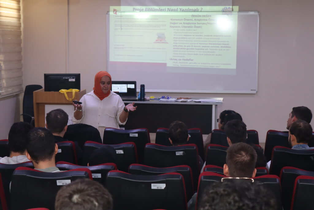Öğr. Gör. Dr. Sümeyye Sınır tarafından verilen kapsamlı eğitimde, “Üniversite Öğrencileri Araştırma Projeleri Destekleme Programı 2209-A” ve “Üniversite Öğrencileri Sanayiye Yönelik Araştırma Projeleri Destekleme Programı 2209-B”na ilişkin proje önerisi, projenin temel bileşenleri, proje bölümleri, özgün değer göstergeleri, araştırma yöntemleri gibi başlıklar altında derinlemesine bilgiler paylaşıldı.
