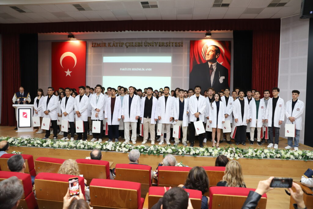 İzmir Kâtip Çelebi Üniversitesi Tıp Fakültesi akademisyenlerinin elinden beyaz önlüklerini giyen öğrenciler, hep bir ağızdan hekimlik andını seslendirerek mesleğe ilk adımını attı.