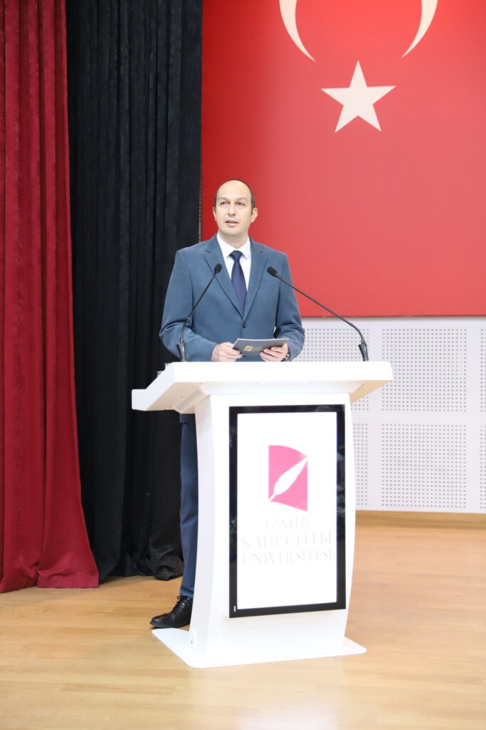 2025 Yılı mezunu Fakülte Temsilcisi Dr. Fatih Ayvaz da İKÇÜ Tıp Fakültesi mezunu olmanın getirdiği sorumluluğa işaret ettiği konuşmasında 6 yıllık süreçte hocalarından aldıkları destek ve motivasyonun mesleki yolculuklarına paha biçilmez bir değer kattığını vurguladı. Dr. Ayvaz, “Tam 6 yıl önce sizin olduğunuz sırada beklerken sadece mutluluk yasarken bulunduğum yerin bizler için neler ifade ettiğini, bu kıymetli fakültenin kendi kurumum olduğunu, o şekilde sahiplenmem gerektiğini yıllar içerisinde fark edene kadar tam olarak anlayamıyordum. Arkadaşlar bu kurum sizlerin, sizlere önlüklerinizi giydirecek kıymetli hocalarınız sizler için burada. Bu duyguyu ne kadar erken yakalayıp, çalışmalarınızı motivasyonunuzu şekillendirirseniz hem öğrencilik hayatinizi büyük bir keyifle geçirmiş olursunuz hem de sizden sonrakilere daha da gelişmiş bir fakülte bırakmış olursunuz. 6 yıl sonra bugün gerçekleştirdiğimiz seremoninin kurum kültürü halinde aktarılması hem sizden sonrakileri fakülteye bağlılığını arttırmada hem de sizlere ve kurumunuza duyulan saygıyı arttırmada kritik rol oynayacaktır. Tekrardan tebrik ediyor, bundan sonraki yolunuzda sizlere başarılar diliyorum” ifadelerini kullandı.