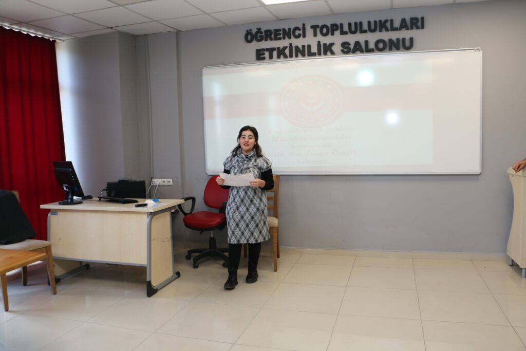 25 Kasım Kadına Yönelik Şiddetle Mücadele ve Uluslararası Farkındalık Günü kapsamında düzenlenen etkinliğin konuk konuşmacısı Uzm. Psk. Öznür Öztürk Sabuncu, şiddetin sadece eğitimsiz ve sosyoekonomik düzeyi düşük kesimlerde değil, toplumun her kesiminde görüldüğünü ve her alanda var olduğunu vurguladı. Şiddeti “Acil tedavi edilmesi gereken bir yara” olarak tanımlayan Uzm. Psk. Sabuncu, şiddetin yaygınlığı, ülkemizde kadına yönelik şiddetin nedenleri ve etkileri, yasal düzenlemeler ve konuya ilişkin doğru bilinen yanlışlardan bahsetti. Dünyada her 3 kadından birinin şiddete maruz kaldığının altını çizen Uzm. Psk. Sabuncu, Türkiye’de 2024 yılı verilerine göre kadına yönelik şiddet oranlarında 2014 yılı verilerine nazaran bir düşüş gözlemlense de kadın cinayetlerinde bir artış yaşandığını aktardı. Kadına yönelik şiddetin nedenlerine ve şiddetin fiziksel, psikolojik, ekonomik ve sosyal etkilerine de değinen Uzm. Psk. Sabuncu, fiziksel, psikolojik, ekonomik, cinsel, siber şiddet gibi şiddet türlerinin kapsamını detaylı bir şekilde ele aldı.