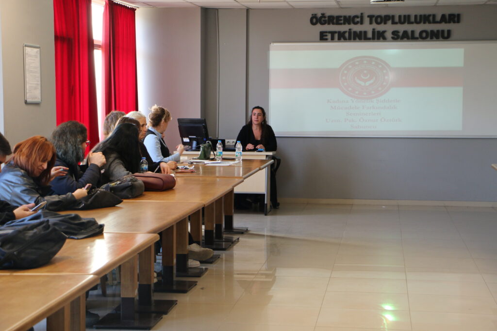 Kadın ve Aile Çalışmaları Uygulama ve Araştırma Merkezi Müdürü, aynı zamanda SKS Kadın ve Aile Çalışmaları Topluluğu danışmanı Prof. Dr. Fatma Akkuş Yiğit ile Müdür Yardımcısı Doç. Dr. Nilgün Nurhan Kara koordinasyonunda Topluluk Etkinlik Salonunda düzenlenen programda, İzmir Aile ve Sosyal Hizmetler İl Müdürlüğü’nde görevli Uzman Psikolog Öznur Öztürk Sabuncu kadına yönelik şiddetle mücadele konusuna ilişkin önemli bilgiler paylaştı.