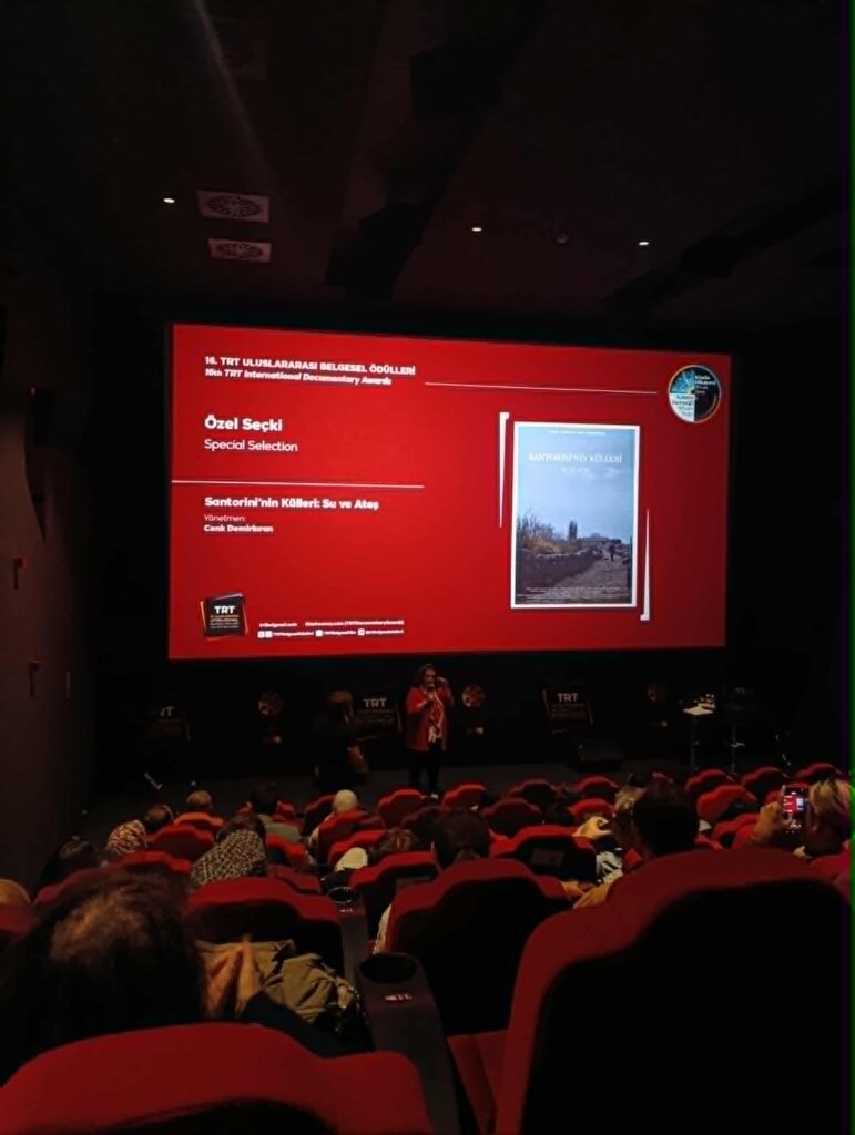 M.Ö. 1650 yılında Ege Denizi’nde gerçekleşen ve tarihin gördüğü en büyük felaketlerden biri olarak anılan Santorini Yanardağı patlamasının Anadolu’ya ve Ege Bölgesi’ne etkilerini konu alan “Santorini’nin Külleri, Su ve Ateş” adlı belgeselin ilk gösterimi, bu yıl “Kimin Hikayesi Kimin Gerçeği” temasıyla düzenlenen 16. TRT Uluslararası Belgesel Ödülleri’nde yapıldı.