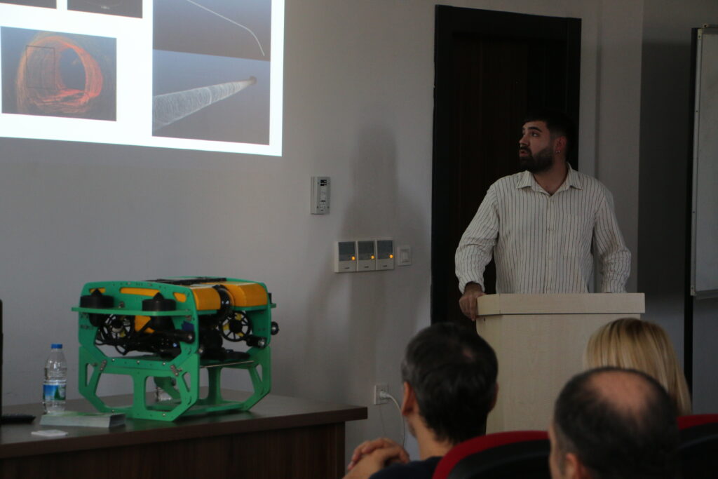 İKÇÜ Su Ürünleri Fakültesi Öğretim Üyesi Doç. Dr. Tuğçe Şensurat Genç’in moderatörlüğünde, Mühendislik ve Mimarlık Fakültesi Konferans Salonunda düzenlenen “Derin Denizlerin Gözü: Explorov” başlıklı etkinlikte, Werover Firması’nda Teknik ve Operasyonel Lider olarak görev yapan Mekatronik Mühendisi Nihat Keyikçi, Explorov’a ilişkin teknik bilgiler verdi.