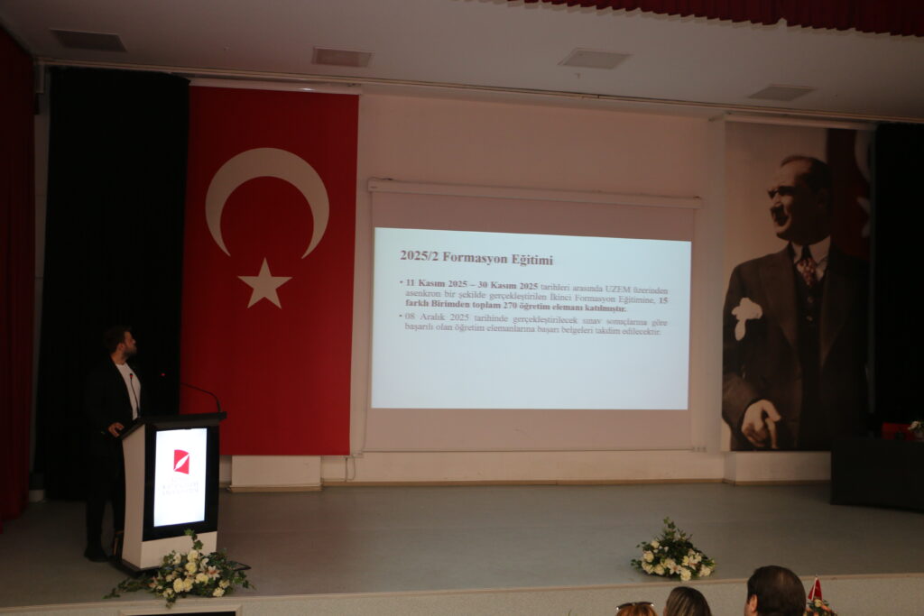 Açılış konuşmasını yapan Bologna Eşgüdüm Koordinatörü Doç. Dr. Necmettin Çelik, eğitim programını, İKÇÜ’de modern eğitim yöntemlerini içeren derslerin sayısının arttırılması ve yaygınlığının sağlanması amacıyla planladıklarını söyledi. Bologna Eşgüdüm Koordinatörlüğü’nün 2025 yılı içerisinde yürütmüş olduğu faaliyetlerden bahseden Doç. Dr. Çelik, “Bizler, bu amaç doğrultusunda ilk olarak üniversite akademik kadrosuna yönelik olarak bir formasyon eğitimi tasarladık. 4 modül ve 25 dersten oluşan bu formasyon eğitiminin içerisinde modern eğitim yöntemleri ve alternatif ölçme teknikleri çokça yer almaktaydı. İlk eğitimimize katılan ve başarılı olan 111 öğretim elemanına başarı belgeleri Rektörümüz Prof. Dr. Saffet Köse tarafından takdim edildi. İkinci eğitimimize ise 15 farklı birimden toplam 270 hocamız katıldı. Yapacağımız sınav sonrasında başarılı olan öğretim elemanlarımıza da başarı belgelerini takdim edeceğiz” dedi. Doç. Dr. Çelik, modern eğitim yöntemlerini ve alternatif ölçme değerlendirme tekniklerini İKÇÜ’de yaygınlaştırmak için Müfredat Reformu Çalıştayı yapmayı planladıklarını ve bu kapsamda tüm birimlerden, iç ve dış paydaşlardan görüş topladıklarını ifade etti. Bu görüşleri, program tasarımı ve çıktılarına yönelik tavsiyeler, öğrenme çıktılarına yönelik tavsiyeler ve ölçme tekniklerine yönelik tavsiyeler olmak üzere farklı başlıklar altında özet rapora dönüştürdüklerinin ve tüm birim yöneticilerine sunduklarının bilgisini veren Doç. Dr. Çelik, yine bu kapsamda Bologna ders içeriği hazırlama ve Bloom taksonomisi isimli bir yardım videosu hazırladıklarını bildirdi. Doç. Dr. Çelik, hizmet içi eğitimler, süreç toplantıları ve deneyim paylaşım toplantıları ile modern eğitim yöntemlerine ilişkin bilgilendirme ve farkındalık faaliyetlerini sürdürdüklerini anlattı.