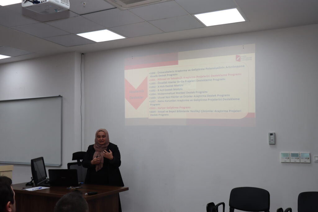 Açılışta yaptığı sunumda, TÜBİTAK 1001-Bilimsel ve Teknolojik Araştırma Projelerini Destekleme ile 3501-Kariyer Geliştirme Programlarına ilişkin kapsamlı bilgiler paylaşan Öğr. Gör. Dr. Sümeyye Sınır, “Eğer iyi bir fikrimiz varsa; bu fikri iyi bir şekilde metin haline getirdiysek, ilk etapta kabul edilmese dahi, projemizi revizyonla kabul ettirebilme şansımız var. Bunun bir süreç olduğunu söyleyebilirim. Başlayacağız, belki ret alacağız ama geri dönecek ve sonunda projemizin kabul edildiğini göreceğiz” dedi.