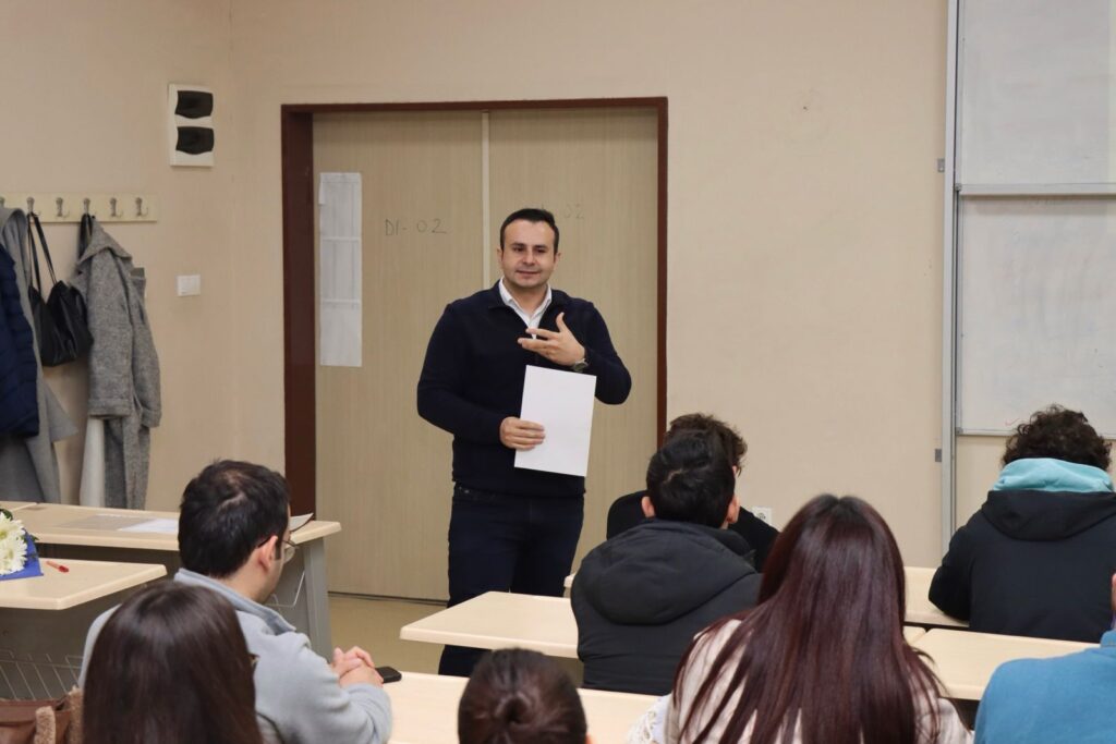 Etkinlikte konuşan Doç. Dr. Mustafa Yalçın, “Bugün, sizlerin arasından çıkan, bu sıralarda yetişen ve sektörde çok iyi işler yapan iki kıymetli konuğumuz var. 2023 mezunlarımızdan, hem öğrencimiz hem de meslektaşımız olan Elif Nihal Şahin ve Nilsu Gülce Demirbaş bugün bizi kırmayarak misafirimiz oldular. Yaptıkları işlere dair sizlere deneyimlerini anlatacaklar. Bu 2 yıllık süre zarfında hayatlarında neler değiştiğini, sektör deneyimlerini ve öğrencilik dönemlerini sizlerle paylaşacaklar. Elif ve Nilsu, kendi şirketlerini kurdular. Bu anlamda iki öğrencimiz de çok idealist. Zaten çok okuyan, araştıran, dersleri aksatmayan, bunun dışında aktif bir öğrencilik dönemi geçiren, örnek öğrencilerimizdiler. Onların tecrübeleri ve önerileri bu yüzden çok kıymetli. Mezuniyetleri sonrasında işlerini yakından takip ettiğim için, hiç pes etmeden küçük küçük adımlarla çok büyük işler yaptıklarına şahit oldum. Önümüzdeki yıllarda işlerini daha da büyüterek ilerleyeceklerine inanıyorum. Arkadaşlarımız kurmuş oldukları Sun Flow Digital Medya Ajansı’ndaki iş deneyimlerini sizlerle paylaşacaklar. Kendilerine çok teşekkür ediyorum” ifadelerini kullandı.