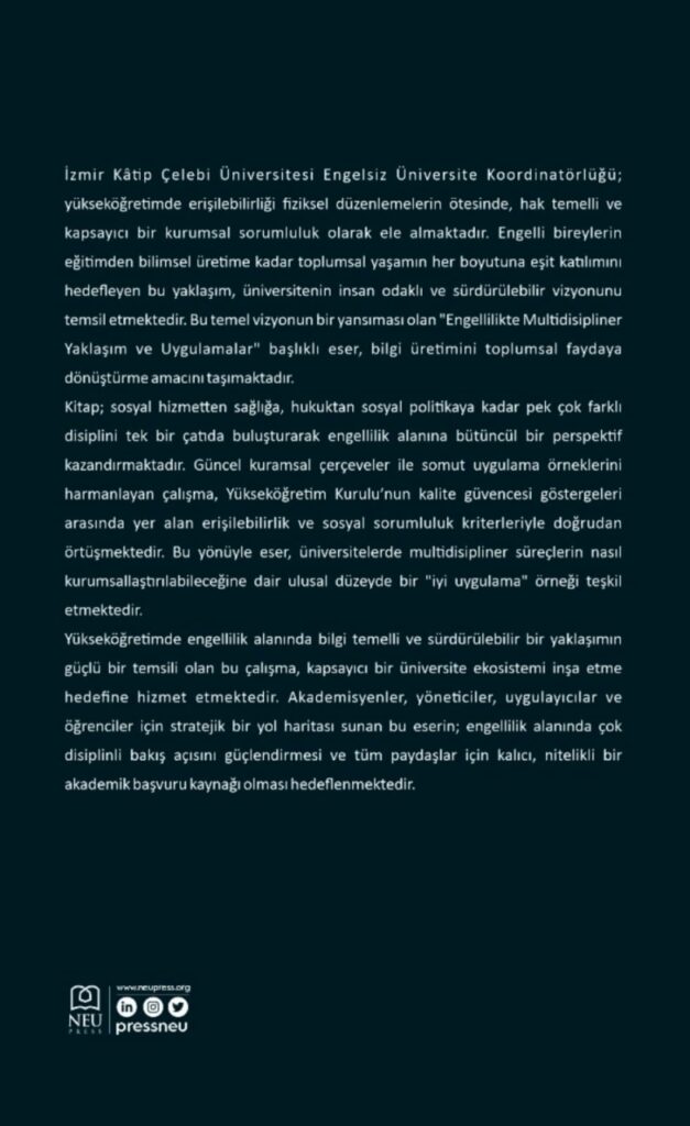 İKÇÜ Yayınevi desteğiyle NEU PRESS tarafından basılan uluslararası yayının, İzmir Kâtip Çelebi Üniversitesi’nin insan odaklı, topluma duyarlı ve kapsayıcı üniversite anlayışının somut bir yansıması olduğunu dile getiren Prof. Dr. Melike Tekindal, “İKÇÜ Engelsiz Üniversite Koordinatörlüğü olarak yükseköğretimde erişilebilirliği, kapsayıcılığı ve hak temelli bir yaklaşımı sağlamak misyonuyla engelli bireylerin eğitim, araştırma ve toplumsal yaşamın tüm boyutlarına eşit katılımını destekleyen sürdürülebilir politikalar geliştirmeyi amaçlıyoruz. Yalnızca fiziksel düzenlemelerle sınırlı kalmayan bu yaklaşım, eğitim-öğretim süreçlerinden bilimsel üretime, dijital erişilebilirlikten toplumsal farkındalık çalışmalarına uzanan bütüncül bir vizyonu temsil etmektedir. “Engellilikte Multidisipliner Yaklaşım ve Uygulamalar” başlıklı eser, İzmir Kâtip Çelebi Üniversitesi’nin hedefleri doğrultusunda bilgi üretimini toplumsal faydaya dönüştüren nitelikli bir akademik çıktı özelliğini taşımaktadır. Bu eser, yalnızca bir akademik başvuru kaynağı olmanın ötesinde; üniversitelerde multidisipliner yaklaşımlar ile erişilebilirlik süreçlerinin nasıl kurumsallaştırılabileceğine ilişkin iyi örnek uygulama niteliği taşımaktadır. Yükseköğretim kurumlarına politika geliştirme, uygulama tasarlama ve farkındalık oluşturma süreçlerinde yol gösterici olmayı hedefleyen bu çalışma ile erişilebilir ve kapsayıcı bir üniversite ekosistemi inşa etme yönündeki ulusal hedeflere katkı sunmayı amaçladık” ifadelerini kullandı.