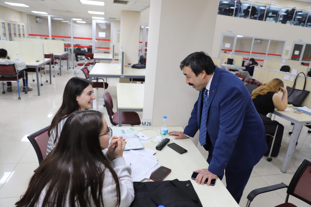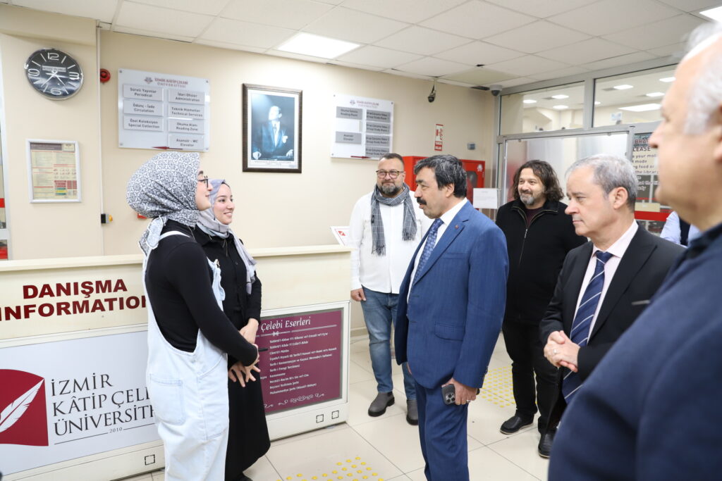 İzmir Kâtip Çelebi Üniversitesi Rektörü Prof. Dr. Saffet Köse, Merkez Kütüphaneyi ziyaret etti. Final haftası nedeniyle kütüphanede ders çalışan öğrencilere başarılar dileyen Prof. Dr. Köse, öğrencilerden gelen geri bildirimler doğrultusunda kütüphanecilik hizmetlerinin her geçen yıl daha da güçlendiğini ifade etti.