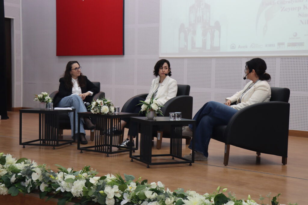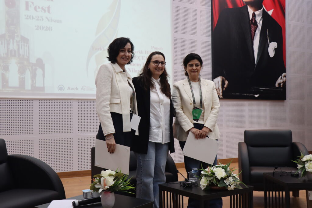 TRT Belgesel Kanalı Koordinatör Yardımcısı Nilay Bilgen’in moderatörlüğünde, İKÇÜ Prof. Dr. Fuat Sezgin Konferans Salonunda düzenlenen söyleşide, Yönetmen Zeynep Keçeciler ve Yönetmen Sinem Dirlik konuşmacı olarak yer aldı. Belgesel sinemanın mutfağına dair önemli ipuçlarının paylaşıldığı söyleşi, üretim süreçlerine dair çarpıcı bir tartışma zeminine sahne oldu. Zeynep Keçeciler ve Sinem Dirlik, belgeselciliğin sadece bir görüntü kaydı değil, bir “dert edinme” ve karakterle kurulan samimi bir bağ süreci olduğunu vurguladı.
