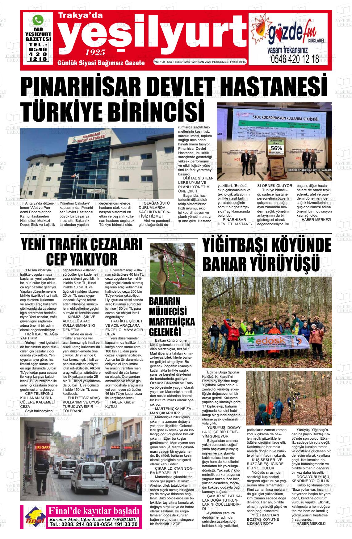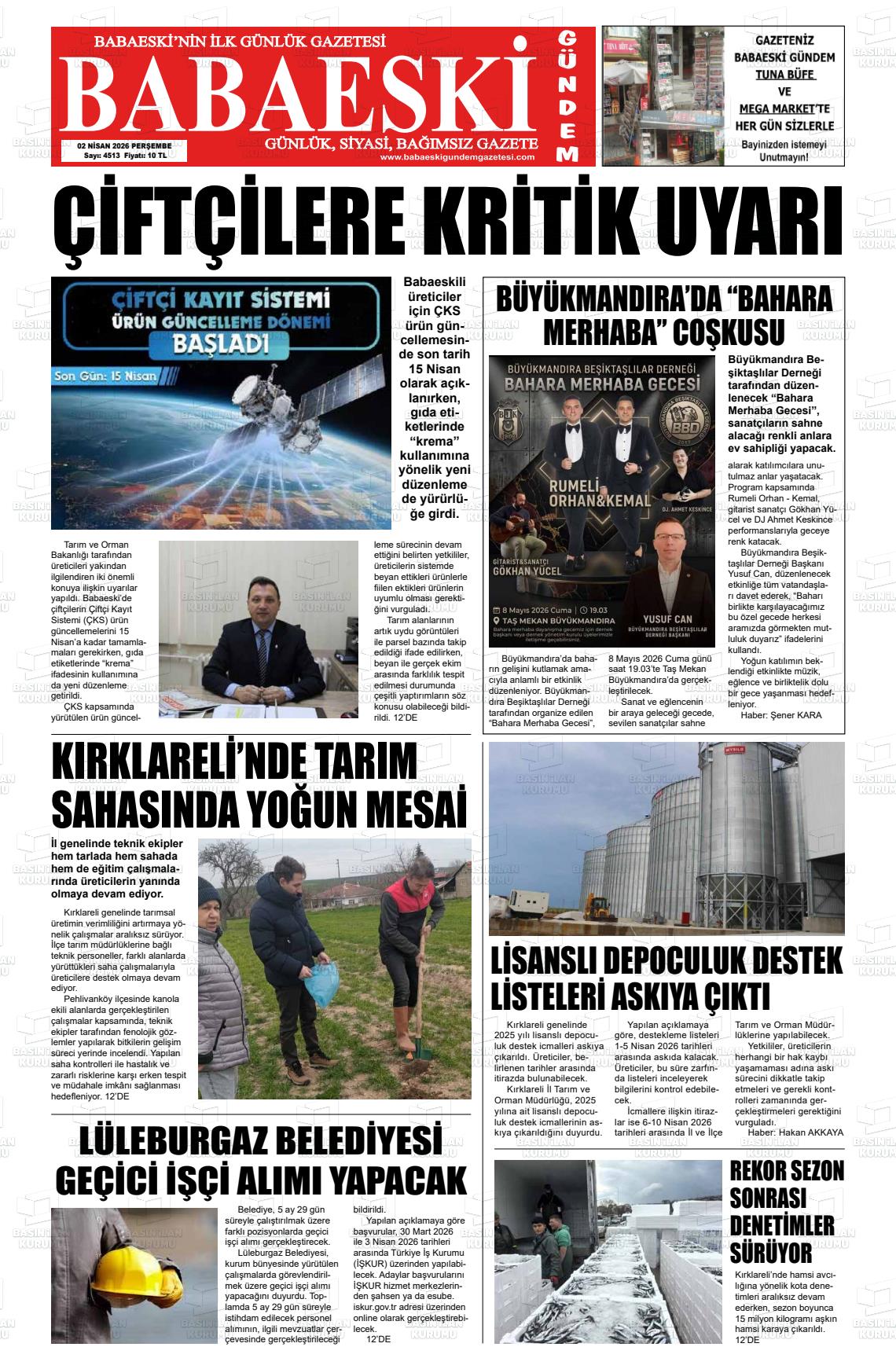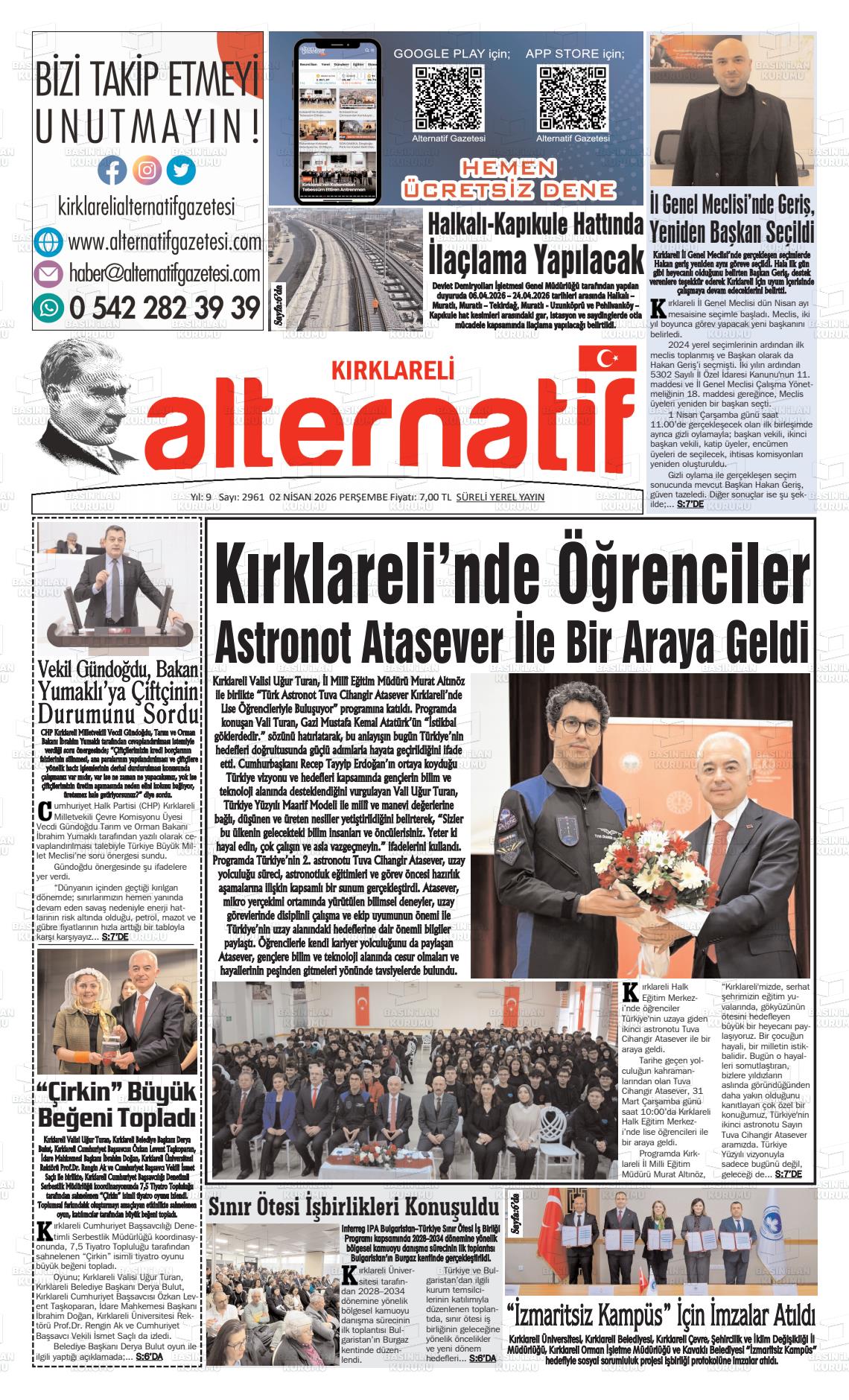 Kırklarelİ Yerel Gazeteleri 02 Nisan 2026, Perşembe Günü Manşeti