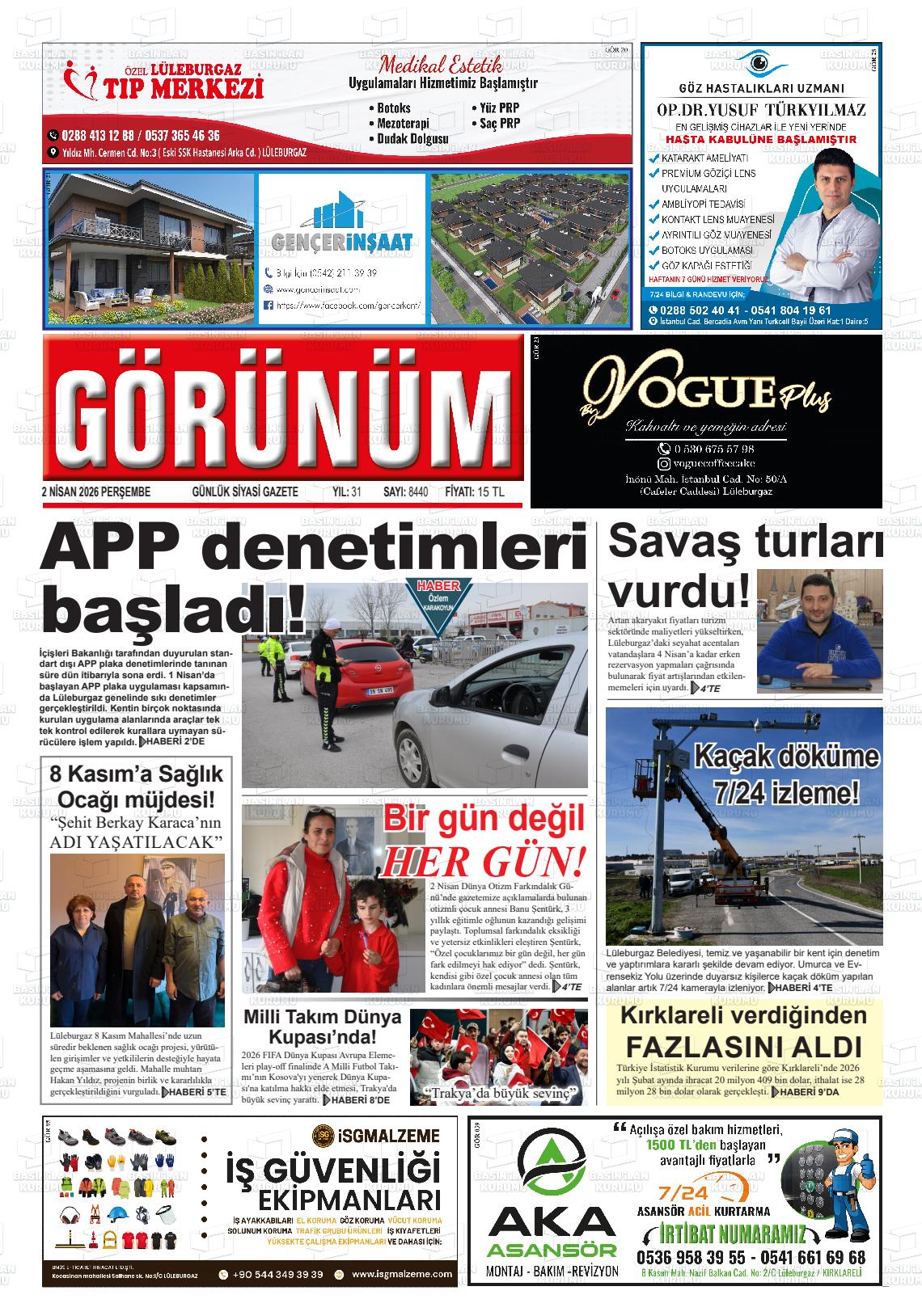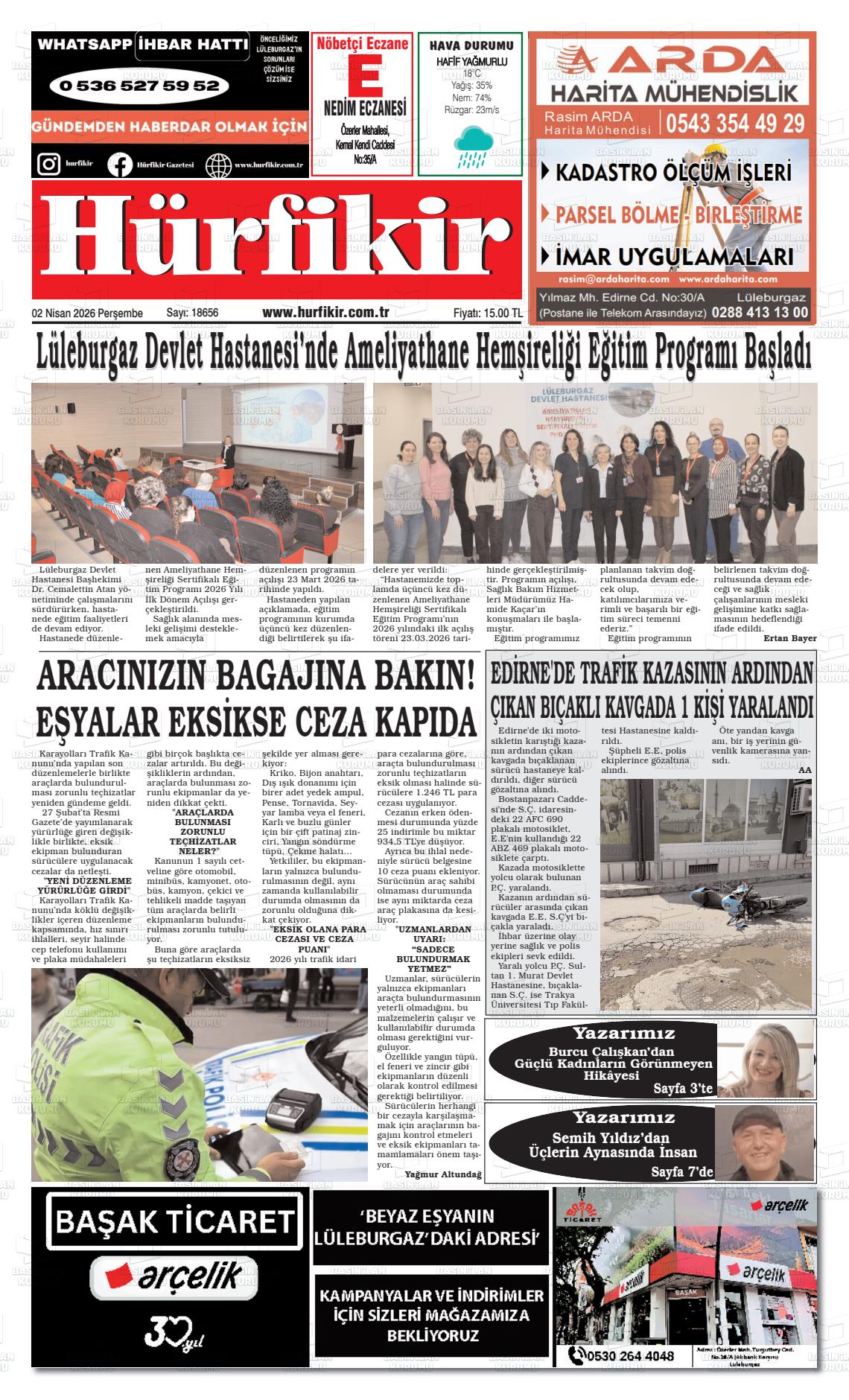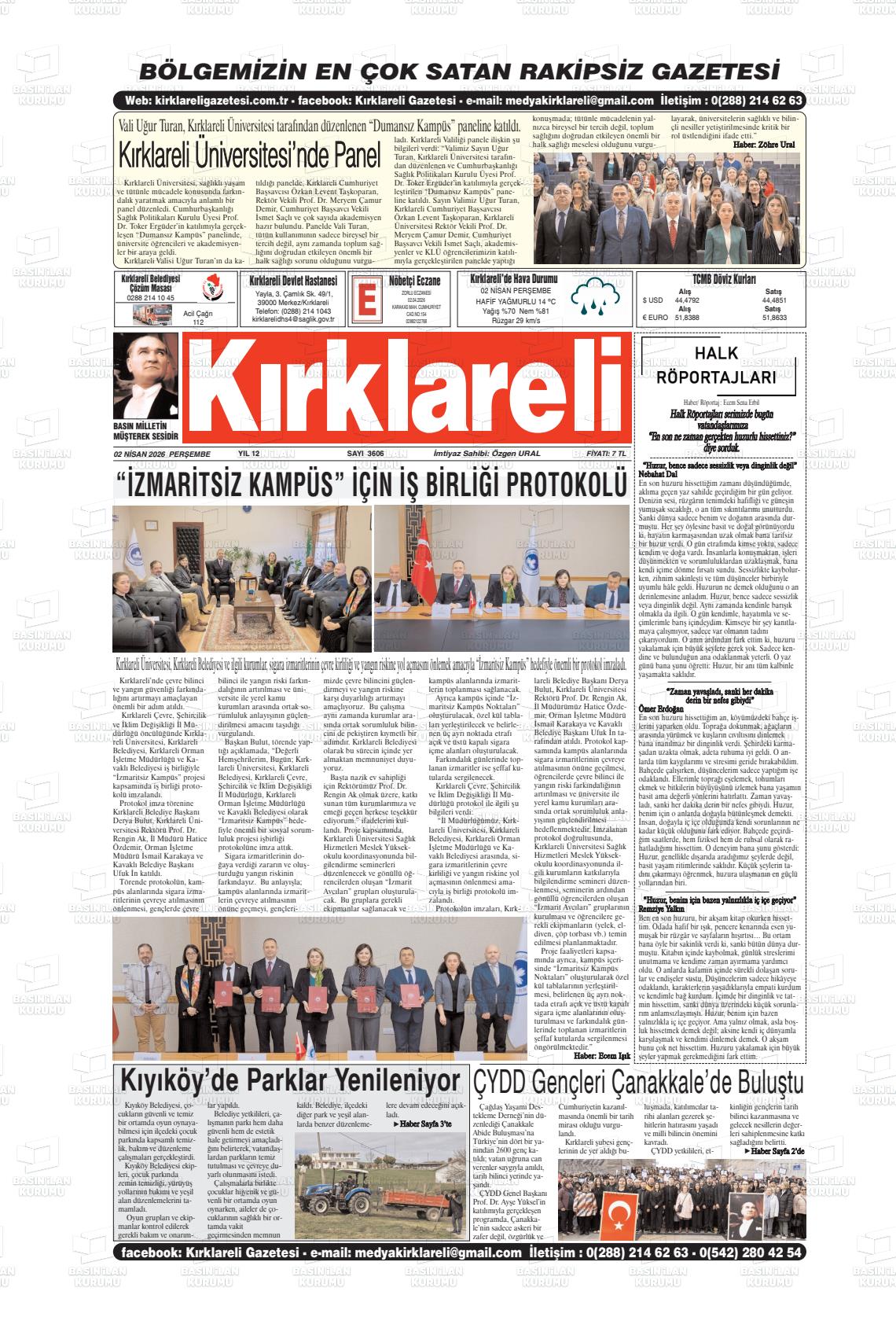 Kırklarelİ Yerel Gazeteleri 02 Nisan 2026, Perşembe Günü Manşeti