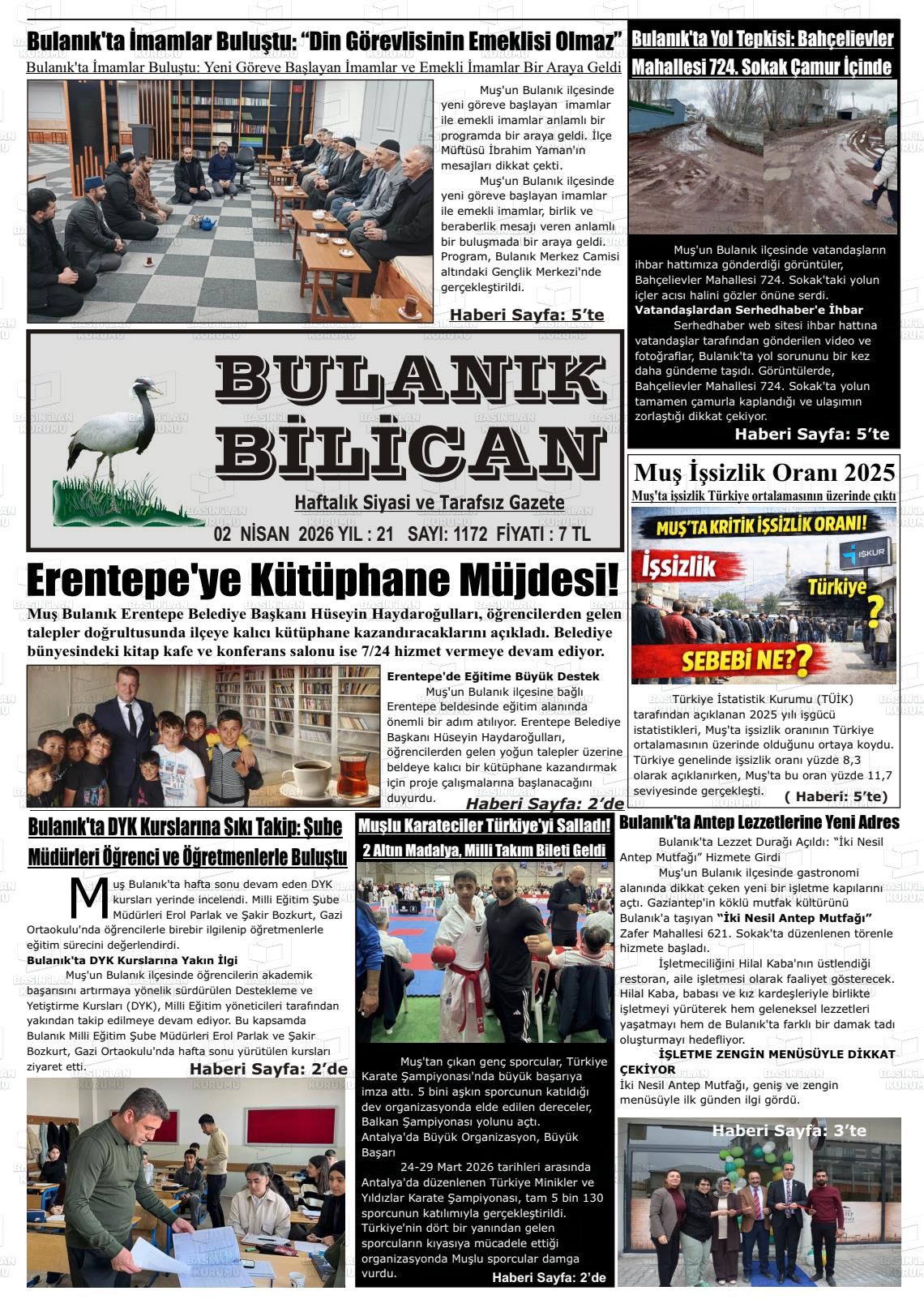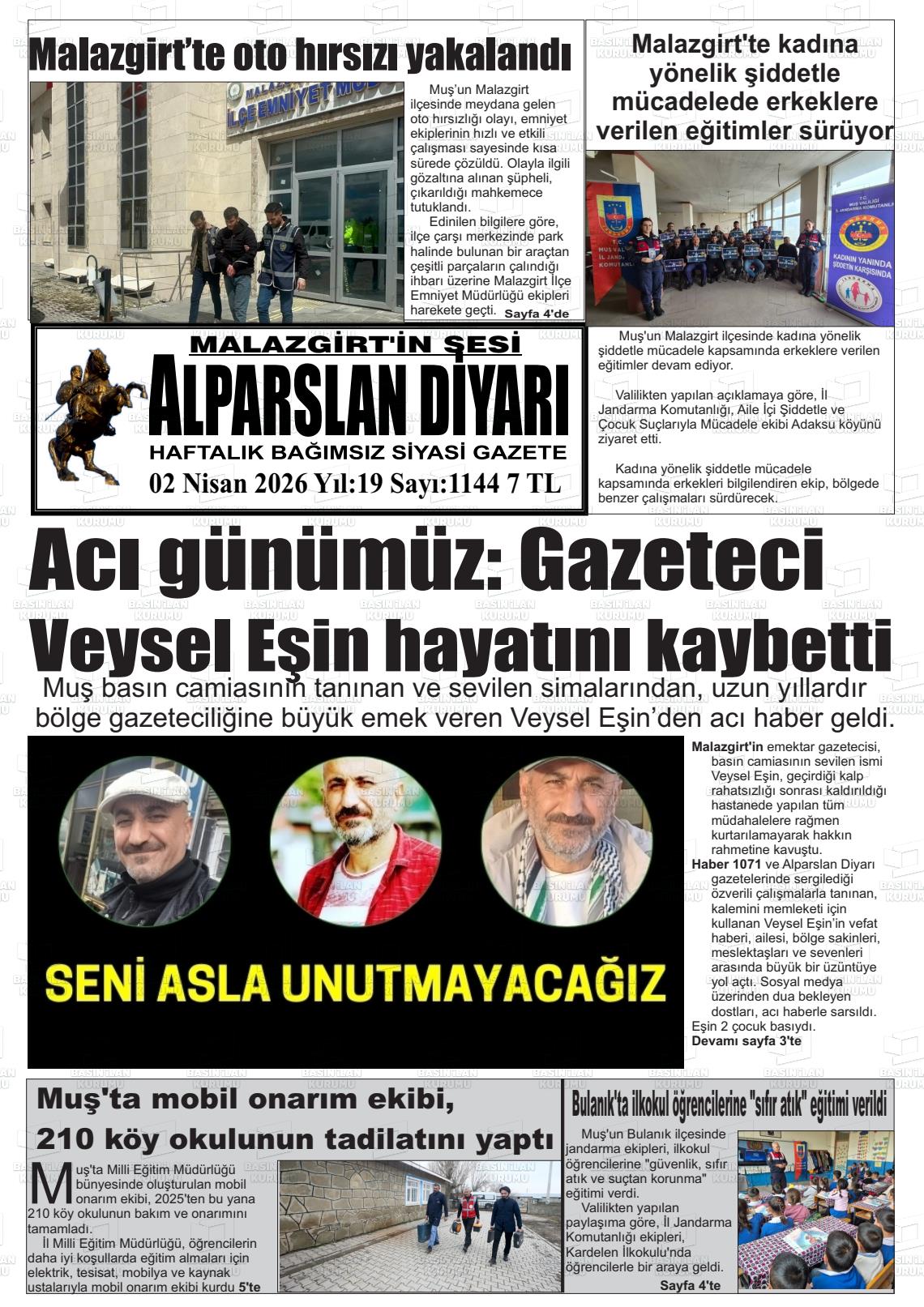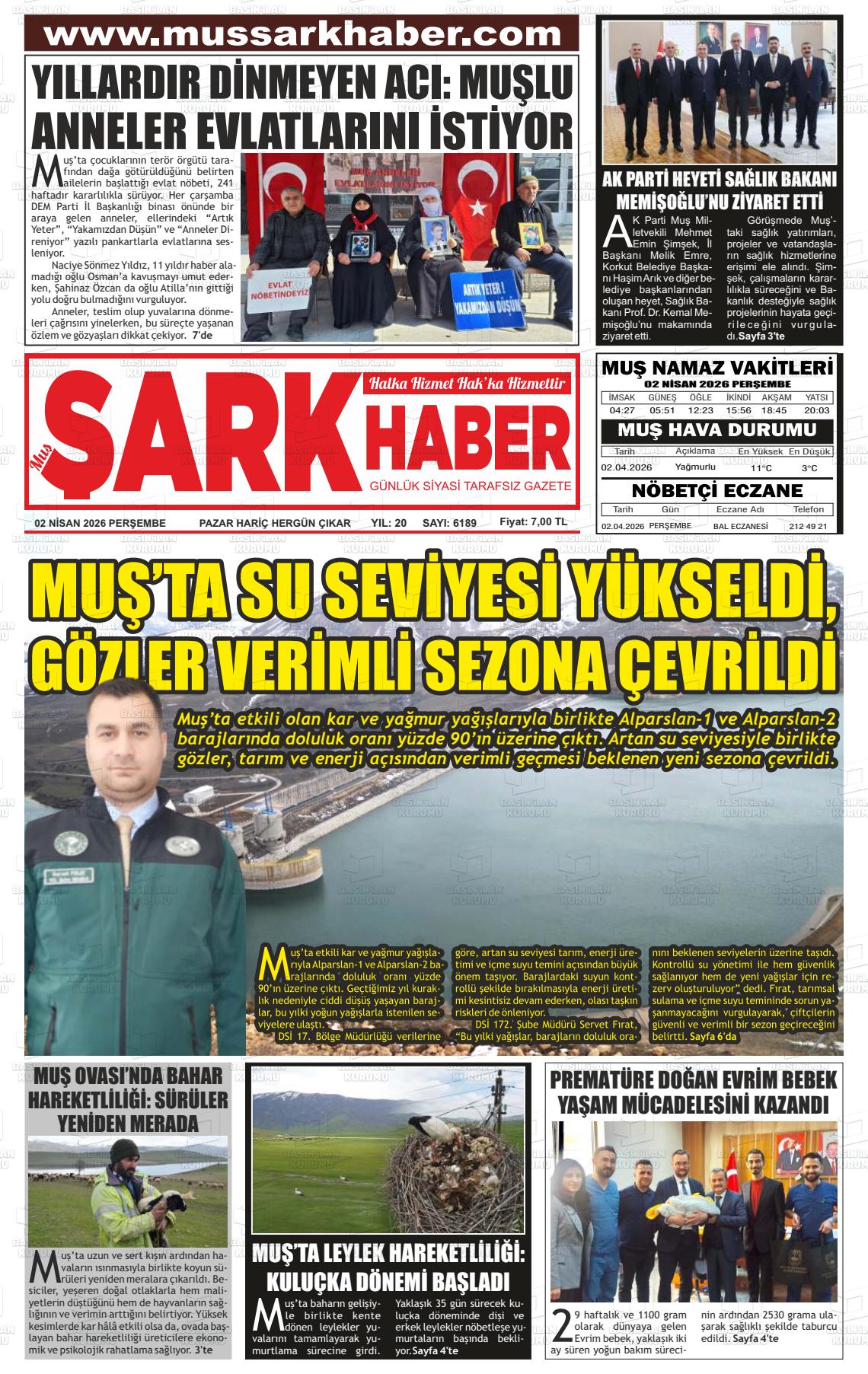 Muş Yerel Gazeteleri 02 Nisan 2026, Perşembe Günü Manşeti